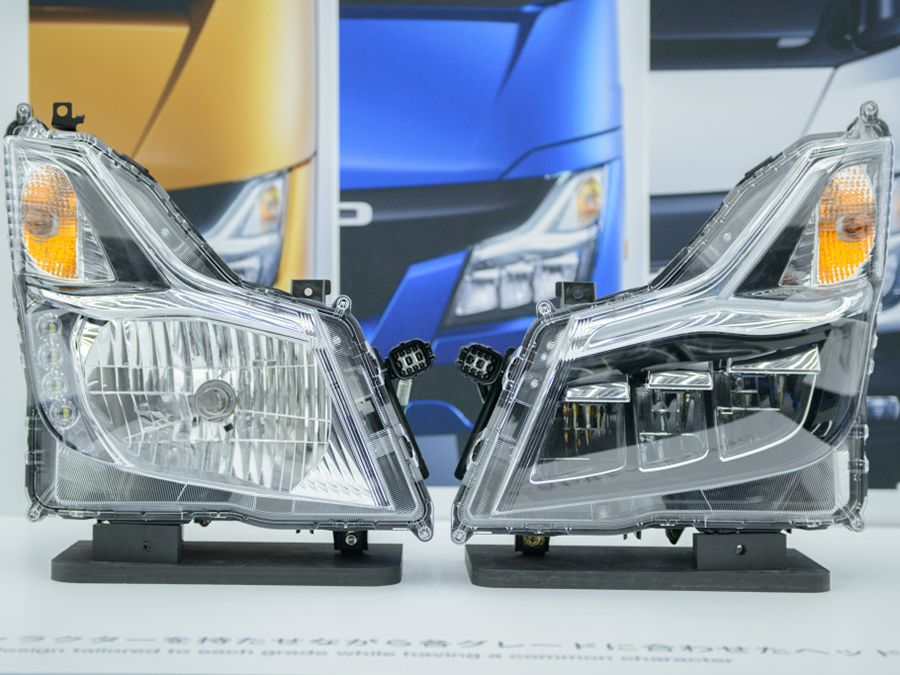 Este aspecto del diseño de producción, y la implementación del motivo Black Belt, también se aplica al faro común LED. El diseño común de los faros, que se utiliza en el Canter, el Aero Ace/Queen y el Rosa, favorece un proceso de desarrollo más eficiente para cada vehículo. Además, con la introducción del faro común, se ha podido reducir el número de piezas de tres a dos, compuestas únicamente por la lámpara y la guarnición. El diseño integrado del faro contribuye no sólo a un desarrollo más eficiente de todo el vehículo sino a la reducción de los costes totales de desarrollo.
